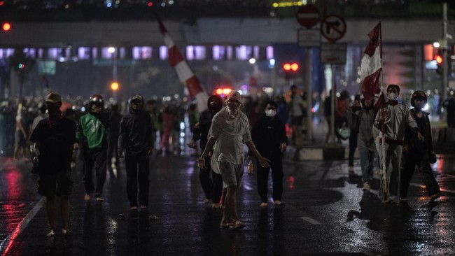 BATAMOKE.COM – Massa aksi yang menggeruduk Mako Brimob terlihat masih berkerumun di dekat lampu merah Senen arah Atrium Jakarta, Jumat (29/9) pagi usai ojol Affan Kurniawan tewas. Sebagian besar dari mereka masih mengoleskan pasta gigi di bagian bawah mata.