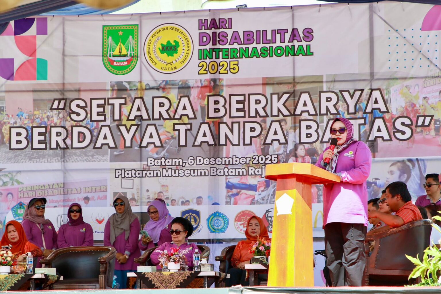 BATAM, BATAMOKE.COM – Ketua Tim Penggerak Pemberdayaan dan Kesejahteraan Keluarga (TP-PKK) Kota Batam, Erlita Amsakar, menghadiri Peringatan Hari Disabilitas Internasional (HDI) yang digelar Koordinator Kegiatan Kesejahteraan Sosial (KKKS) Kota Batam di Dataran Engku Putri, Sabtu (6/12/2025).